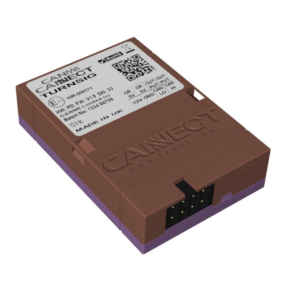 Die CANM8 CANNECT TURNSIG ist eine CAN-Bus-Schnittstelle, die eine gleichmäßige 12-V-Ausgabe für die linken und rechten Blinker von Fahrzeugen mit CAN-Bus-Verkabelung liefert.